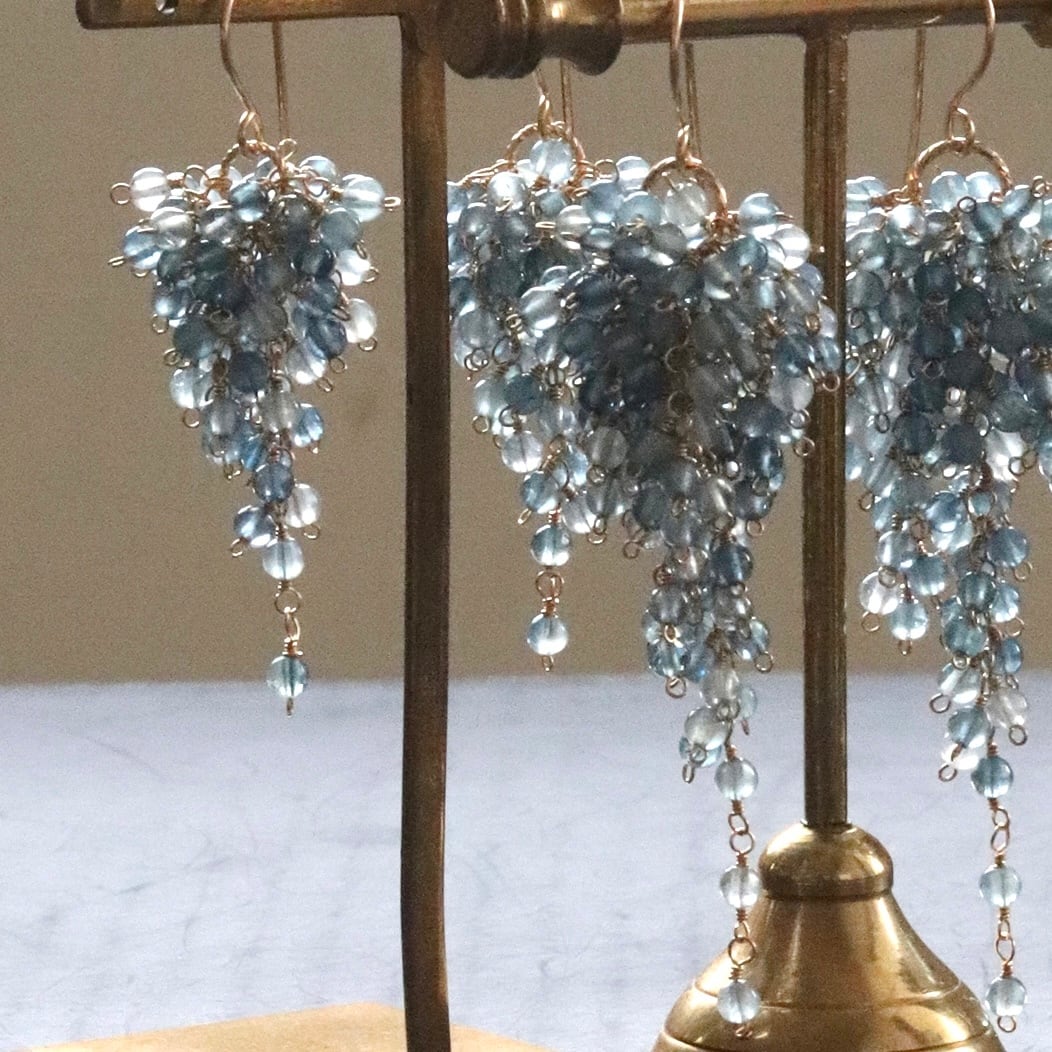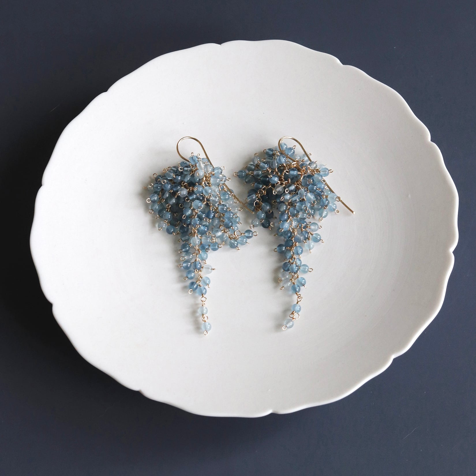ナミビア産・ディープブルーアクアマリンを贅沢に繋げた、大ぶりで華やかなスワッグの耳飾りです。