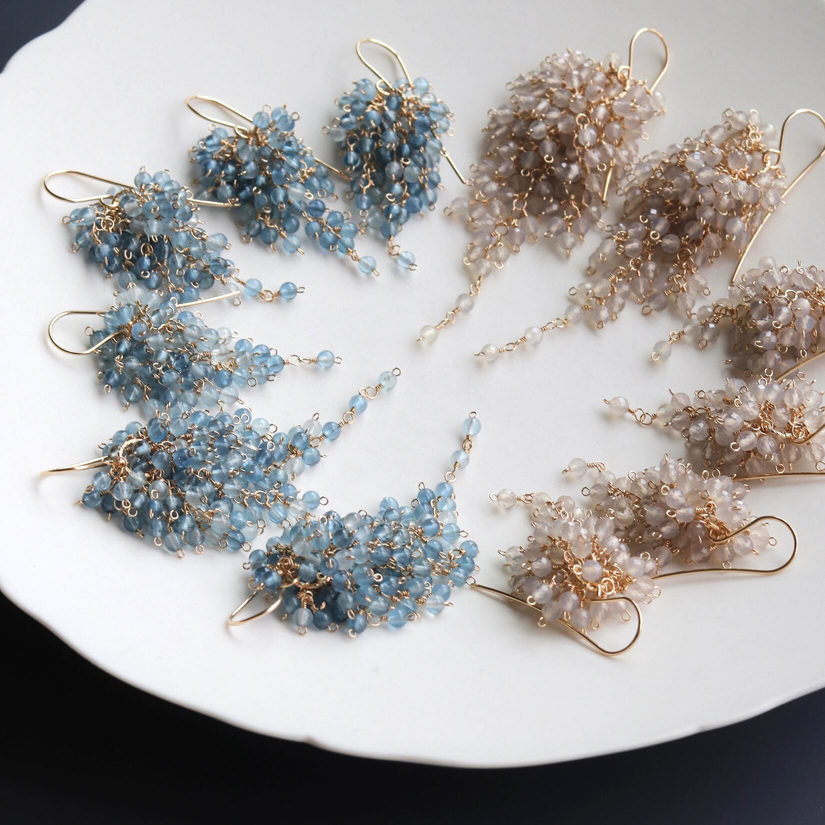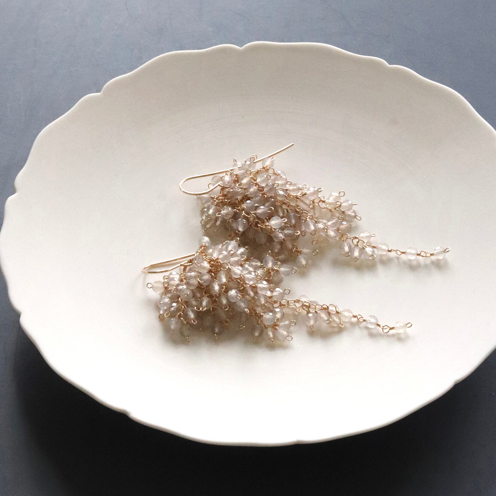 石そのものは落ち着いたアイスグレーですが、14Kgfのゴールドワイヤーを使用することで、全体としてほんのりゴールドがかった印象に。
