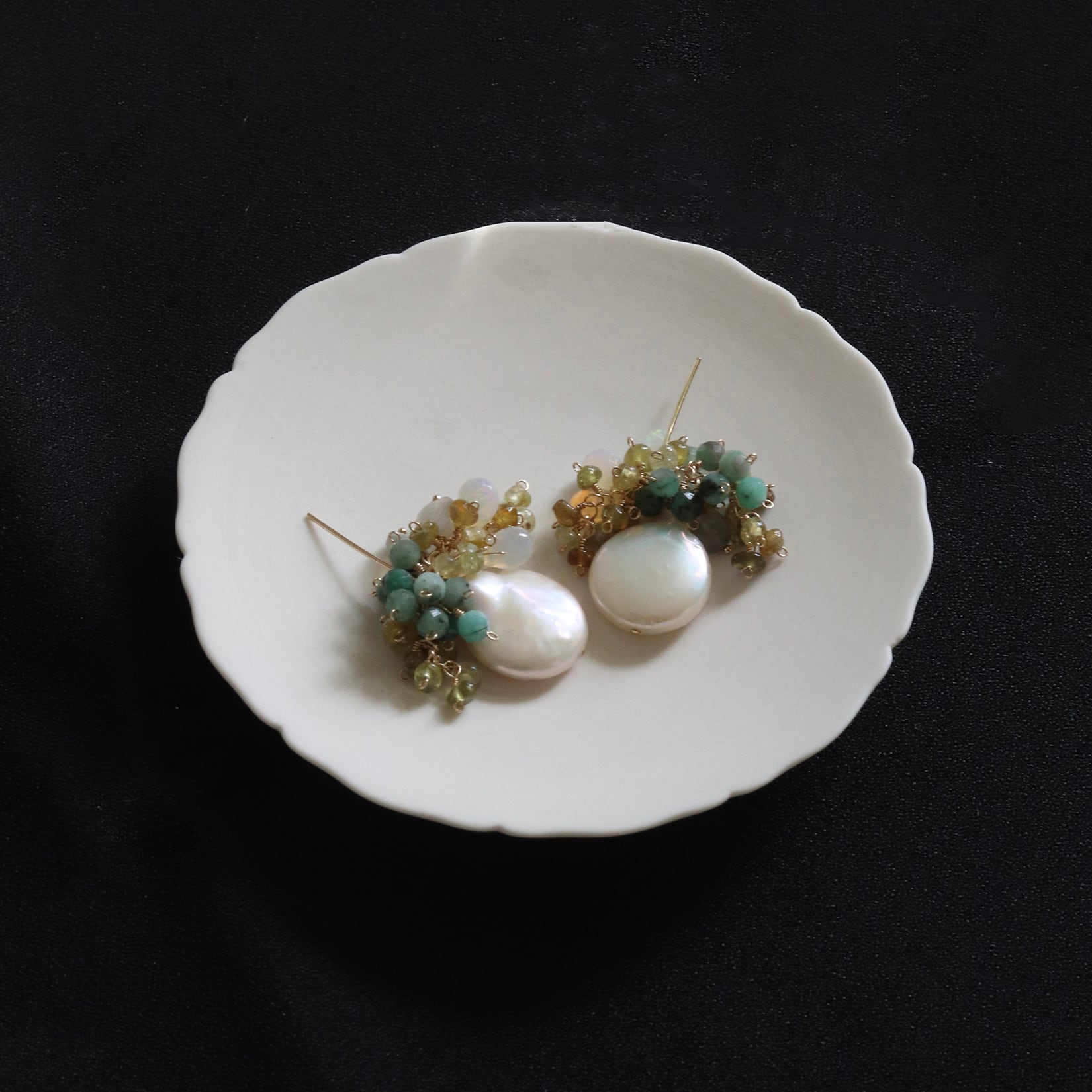 コイン形状の淡水パールが優雅な光を放ち、エチオピアオパールの神秘的な輝きが耳元に華やかさを添えます。白い輝きが綺麗なグレームーンストーンが見え隠れし、アクセントになる深い緑色のエメラルドと温かみのある秋色のグロッシュラーガーネットで全体をまとめました。